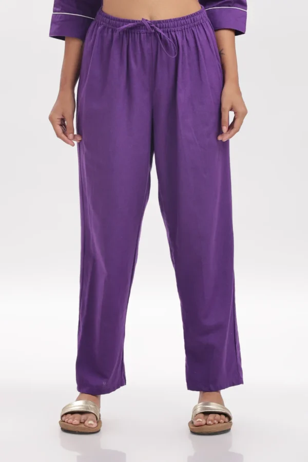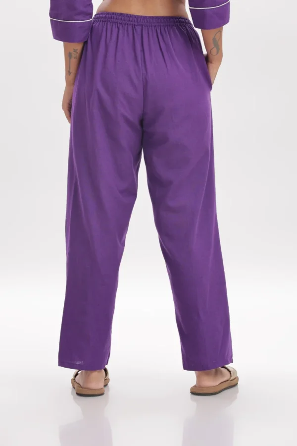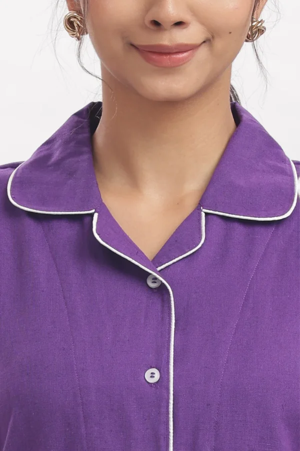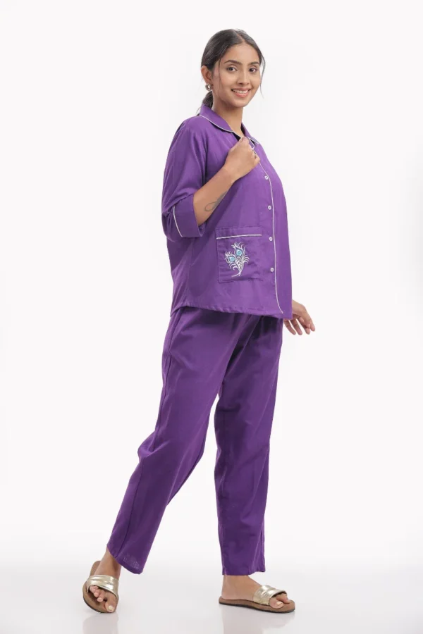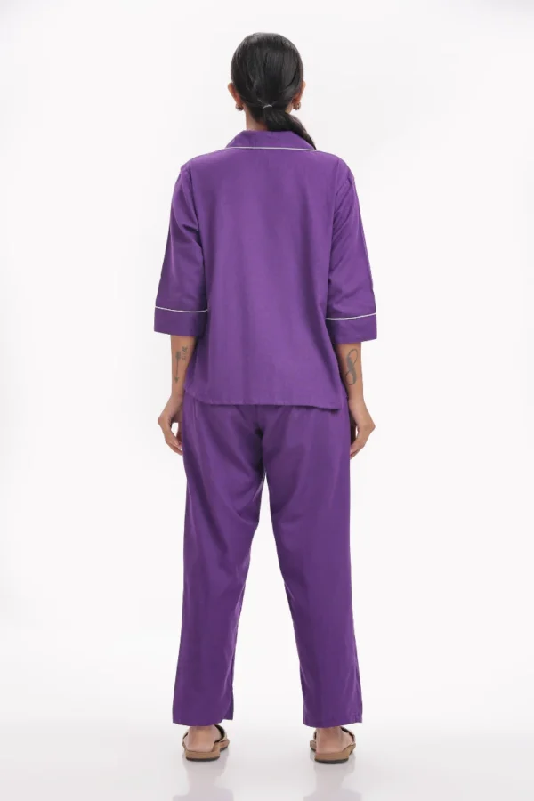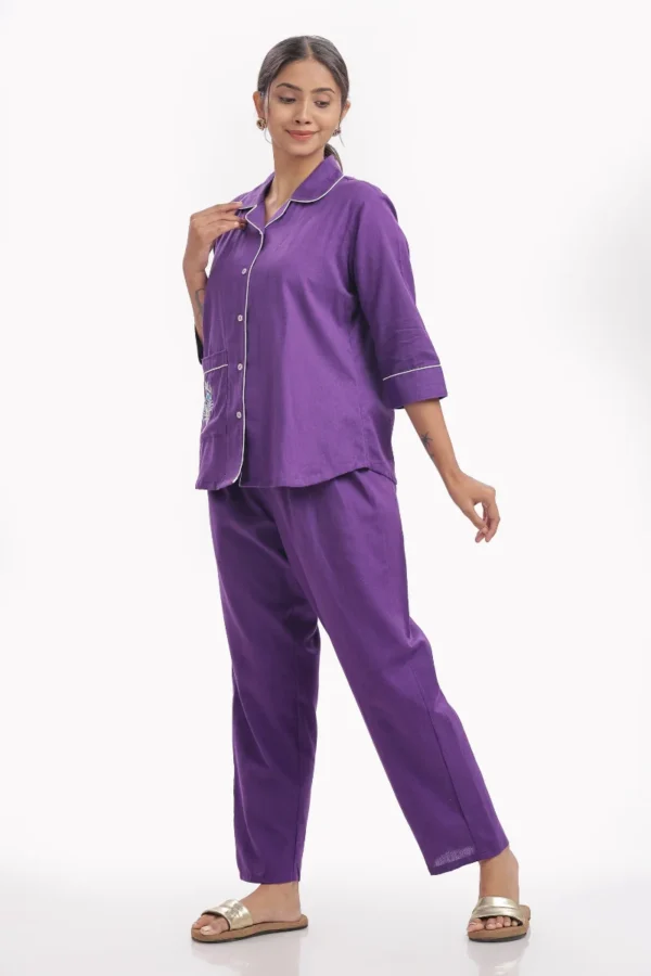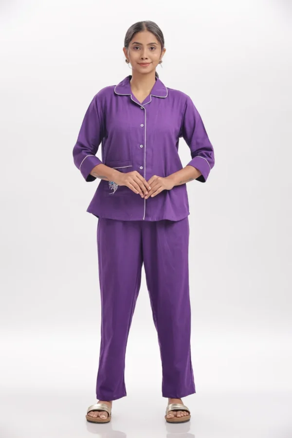 Drift into serene comfort with this Amethyst Comfort Nightwear Set, crafted from breathable cotton slab fabric for an ultra-soft, airy feel. The rich deep purple tone, accented with contrast white piping and delicate embroidery on the pocket, adds a hint of playful elegance to your nighttime routine.