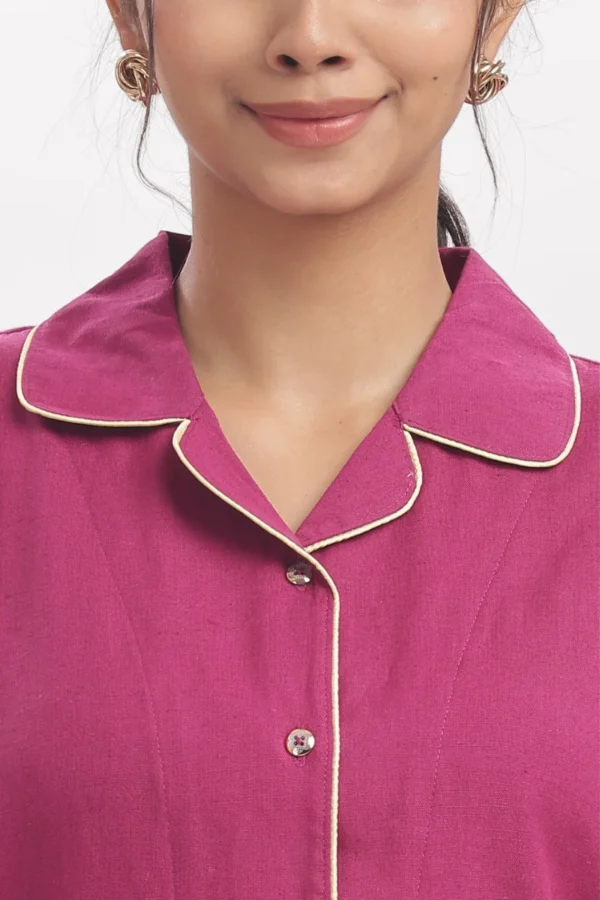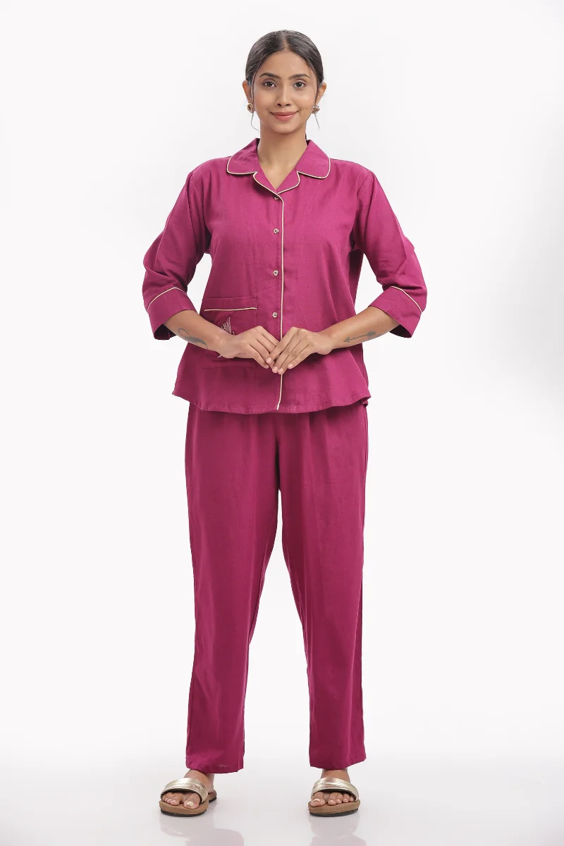 Relax in style with this Berry Bliss Nightwear Set, crafted from breathable cotton slab fabric that feels soft and gentle on your skin. The rich deep berry pink color, accented with contrast piping and an elegant butterfly embroidery on the pocket, brings a playful yet refined charm to your evenings.