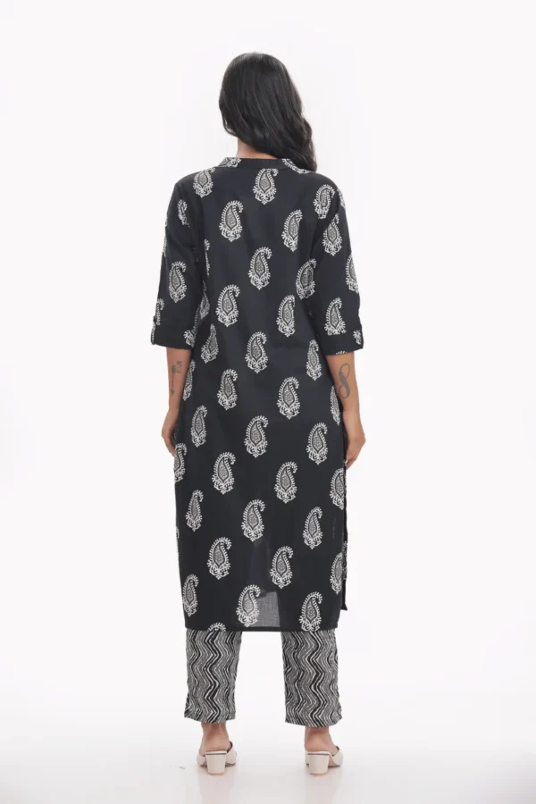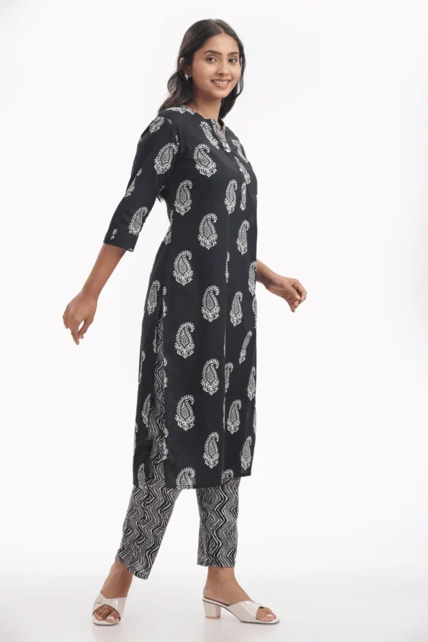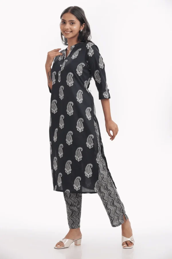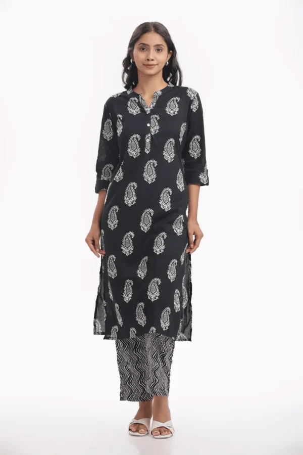 The kurta features a black base with traditional white paisley motifs, a classic round neckline with V-slit, button-down detail, and 3/4th sleeves. It’s paired with striking zigzag printed white pants that add a modern twist to the traditional design. Whether you’re heading to work, a casual day out, or a small get-together, this set keeps you looking polished and graceful.