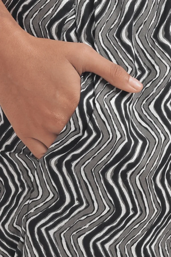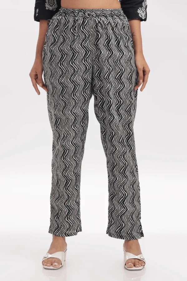 - Bottom: Cambric cotton zigzag printed pants (full-length, elasticated waist)