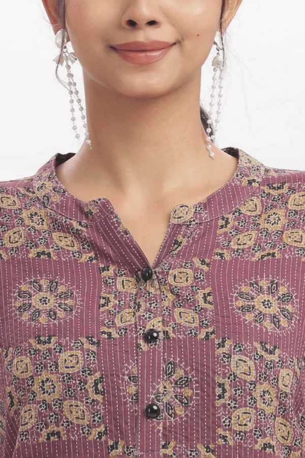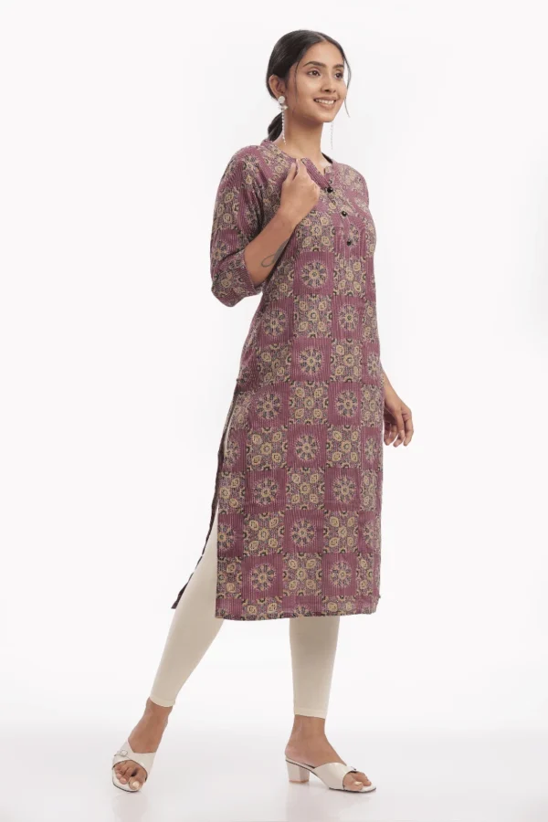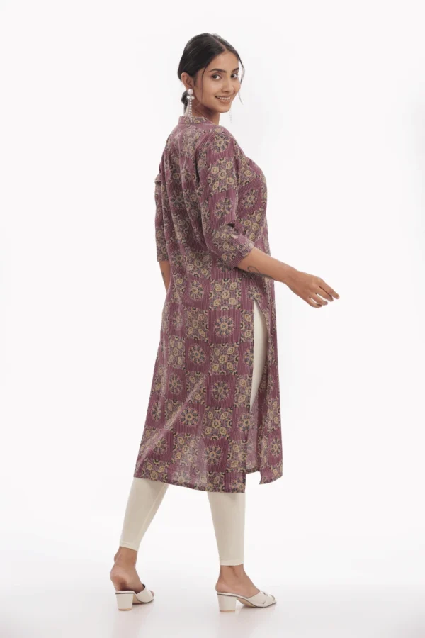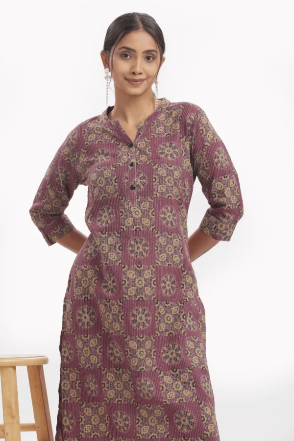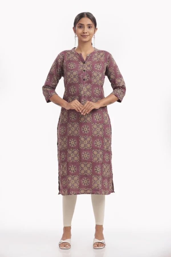 Discover understated elegance with this Vintage Mauve Cambric Cotton Kurta, crafted from breathable and lightweight cambric cotton that keeps you comfortable all day. The kurta features intricate tile-inspired floral motifs in earthy tones set against a rich mauve base, blending tradition with contemporary appeal.