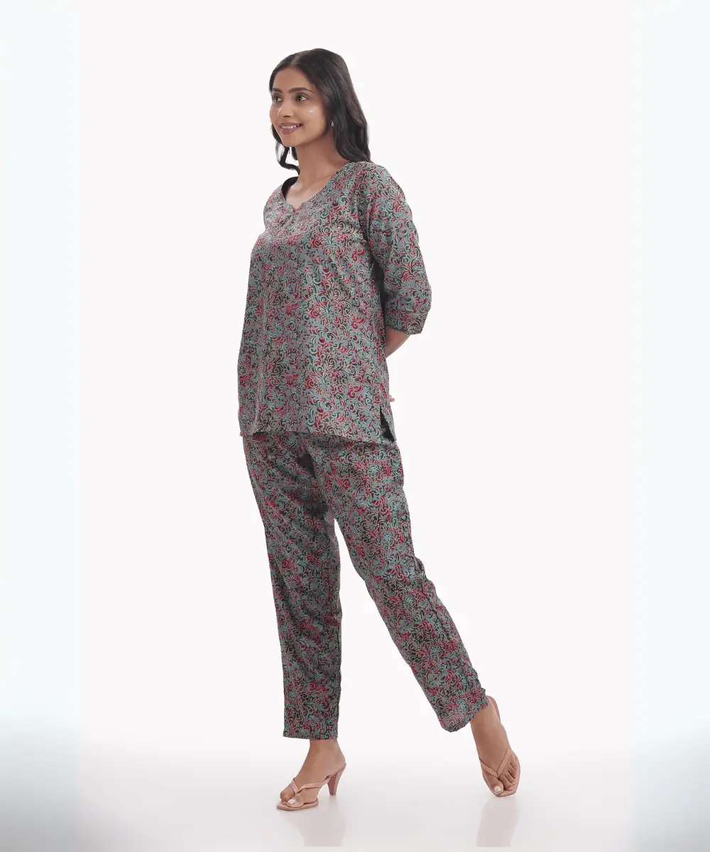 Elegant Floral-Printed Night Suit in Lizzy Bizzy Cotton – Grey with Multicolor Accents